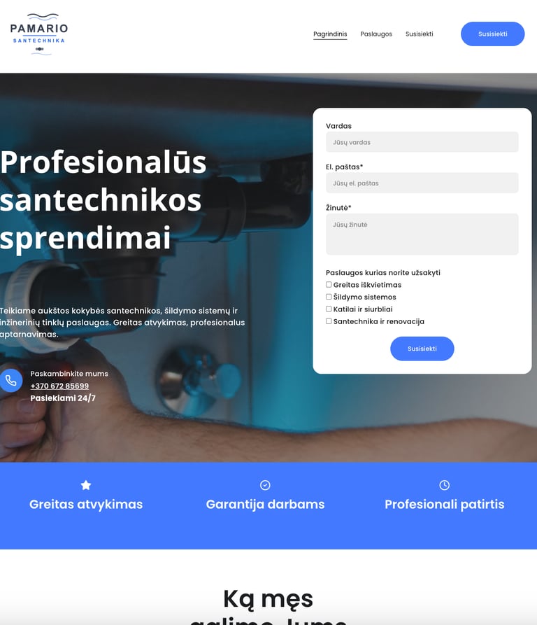 Pamario santechnika is a clean and straightforward website created for a plumbing and heating services provider. The project focuses on clarity, trust, and accessibility, following a minimalist design philosophy.